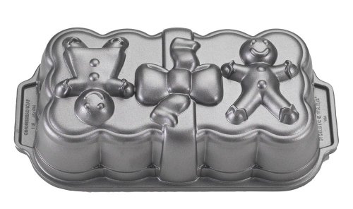 This adorable gingerbread loaf pan from NordicWare's Platinum baking series brings extra festivity to seasonal breads and cakes. Shaped like a scallop-edged present with a ribbon bow and two gingerbread doll toppers, the pan transforms 10 cups of batter into it's own self-wrapped gift. Bakers will love the heavyweight cast aluminum construction for its gentle, balanced heating that produces deliciously moist centers and lightly browned crusts. The pan also features a nonstick interior for easy food release and a heat-reflective exterior to prevent edges from overcooking and burning. Especially durable and warp-resistant, every detail on the pan transfers clearly to the baked good--from the creases in the ribbon to the dolls' big smiles. Two end handles and a narrow rim make for easy flipping and carrying. Measuring 10-3/4 by 5-1/2 by 2-5/8 inches, this pan is best washed by hand to ensure years of quality service. It is made in the USA and comes with a limited lifetime warranty. --Kara Karll